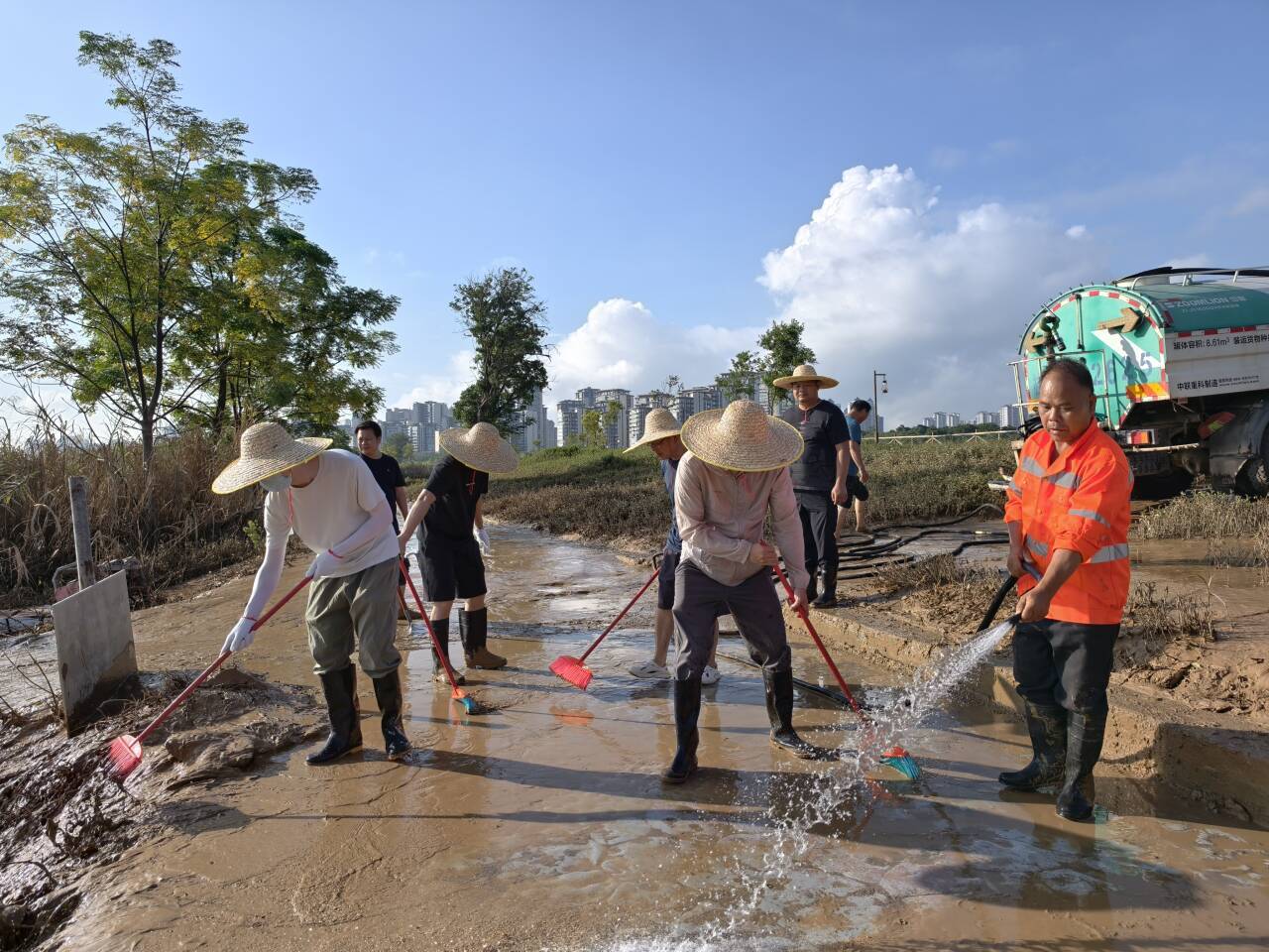 上午8點(diǎn),志愿者們攜帶鐵鏟、刮泥板、掃帚、垃圾袋等工具,準(zhǔn)時在指定區(qū)域集合。現(xiàn)場的淤泥最深處達(dá)10余厘米,腳一踩便陷進(jìn)去難以拔出,鏟子剛插進(jìn)泥里就被牢牢黏住?!按蠹曳止じ?,先刮表層泥,再清垃圾!” 隨著一聲號召,志愿者們迅速分組行動:有的彎腰緊握刮泥板,順著步道紋理反復(fù)刮除黏連的淤泥;有的扛著水管,利用高壓水槍沖刷地面;有的拎著垃圾袋,蹲下身細(xì)致?lián)焓安卦诓菘p里的垃圾;有的則推著清運(yùn)車,來回穿梭將裝滿淤泥和垃圾的袋子及時運(yùn)離現(xiàn)場…… 各個環(huán)節(jié)銜接緊密、井然有序。盡管天氣炎熱,汗水順著臉頰滑落、浸透衣衫,志愿者們的熱情與干勁絲毫未減,充分展現(xiàn)了國企的責(zé)任與擔(dān)當(dāng)。